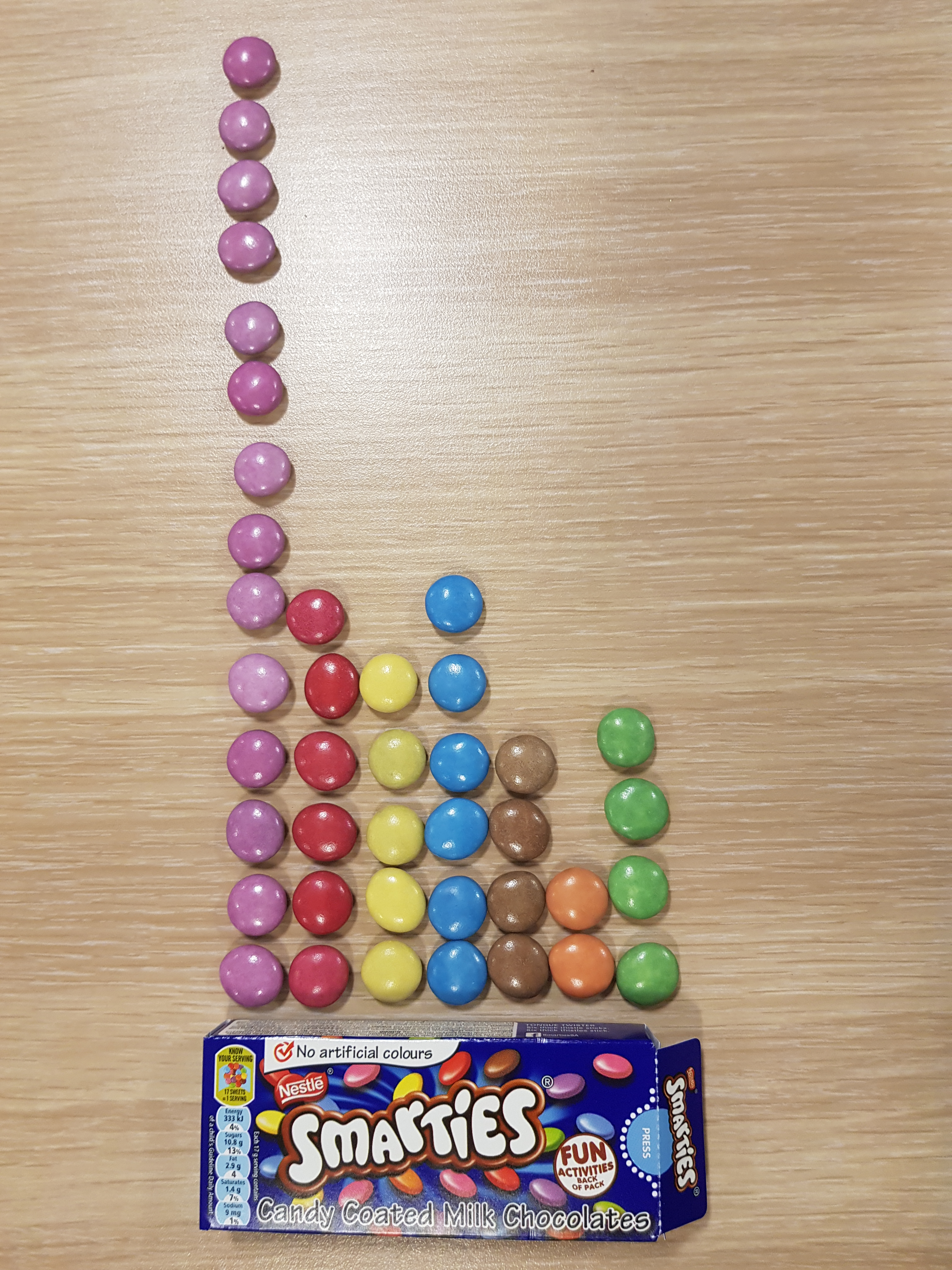 Smartie colours. This particular box of smarties consists of the following: