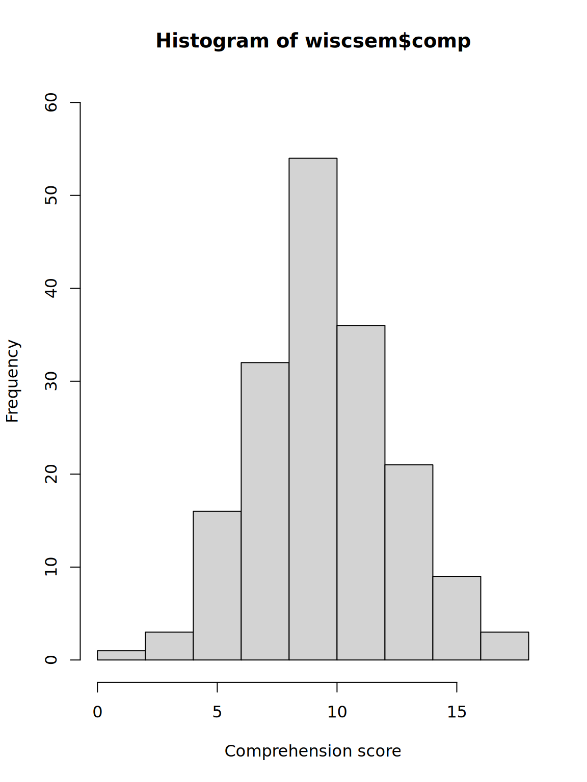 What is the proportion of children scoring less than 5 on the comprehension measure? Use the plot and frequency table. Use the code chunk below