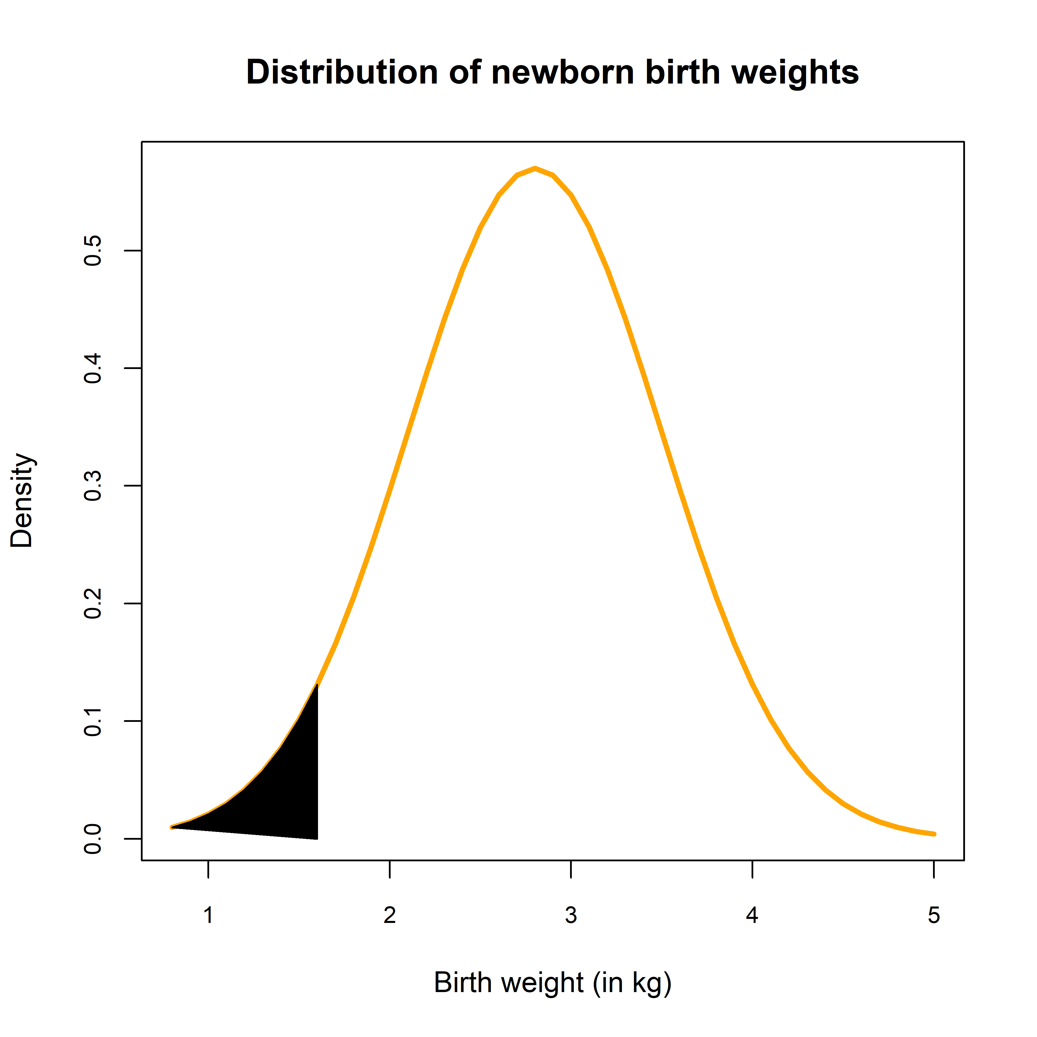 Let’s look at simulated birth weight scores, in the object vector named “birth.weight”, that comes from a Normal Distribution of mean (\(\mu\)) 2.8kg and standard deviation (\(\sigma\)) 0.7kg.