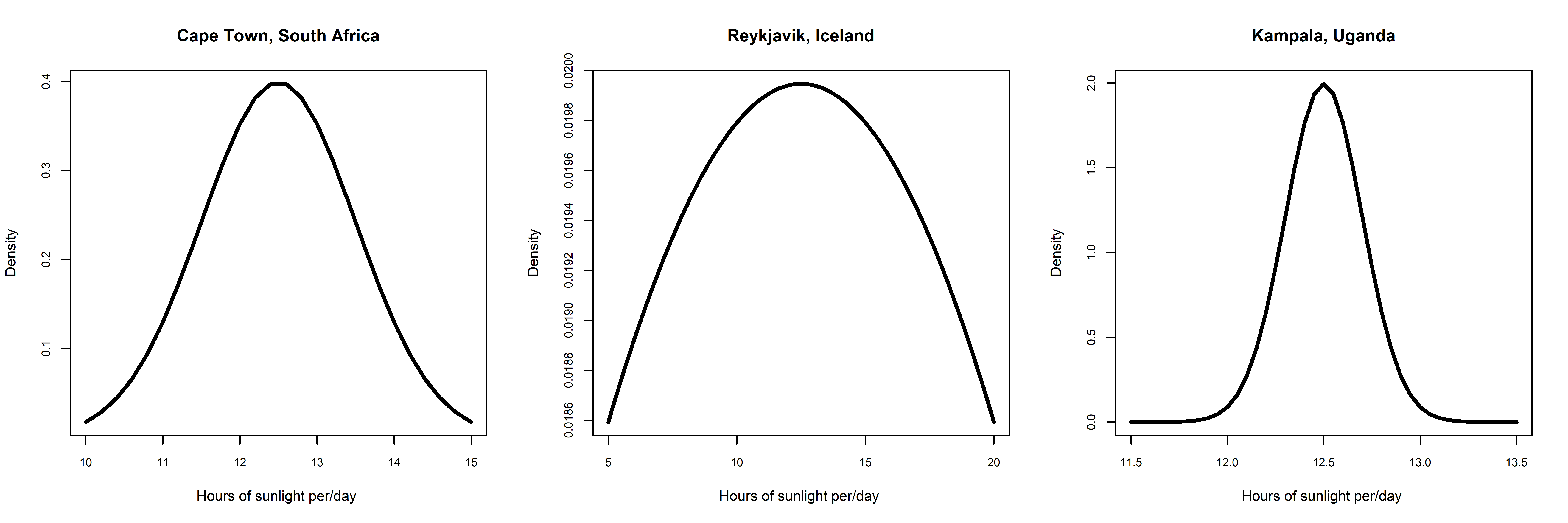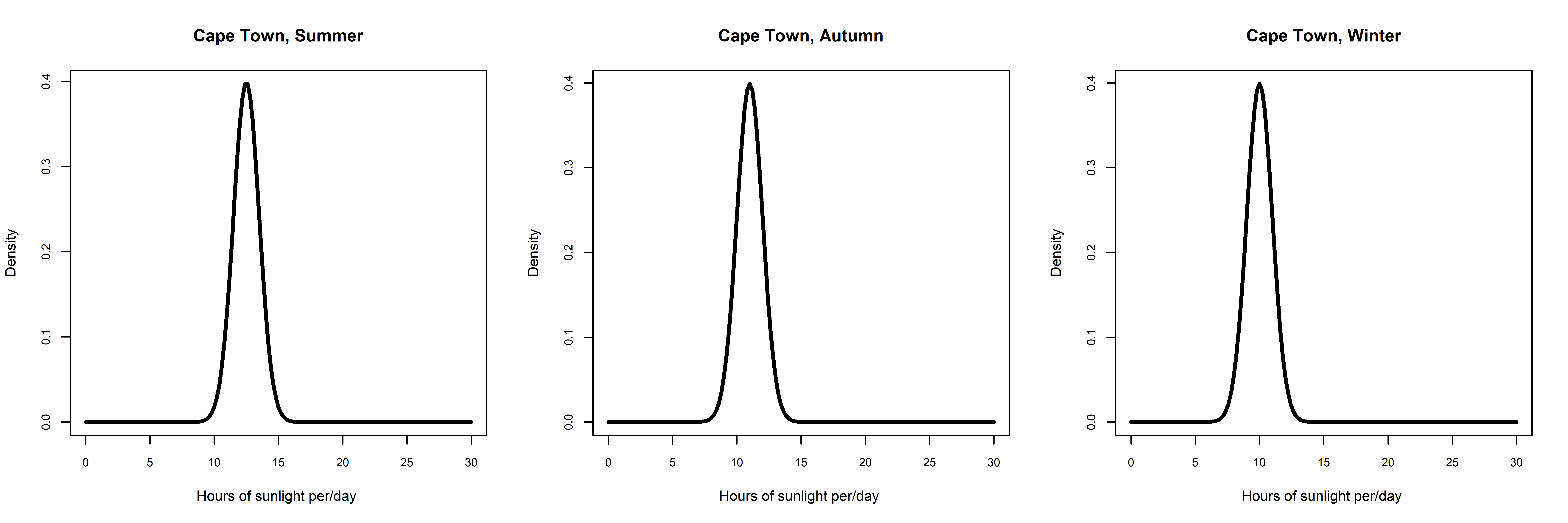 Normal distributions of daily hours of sunlight in Cape Town are displayed for the following seasons; Summer, Autumn and Winter