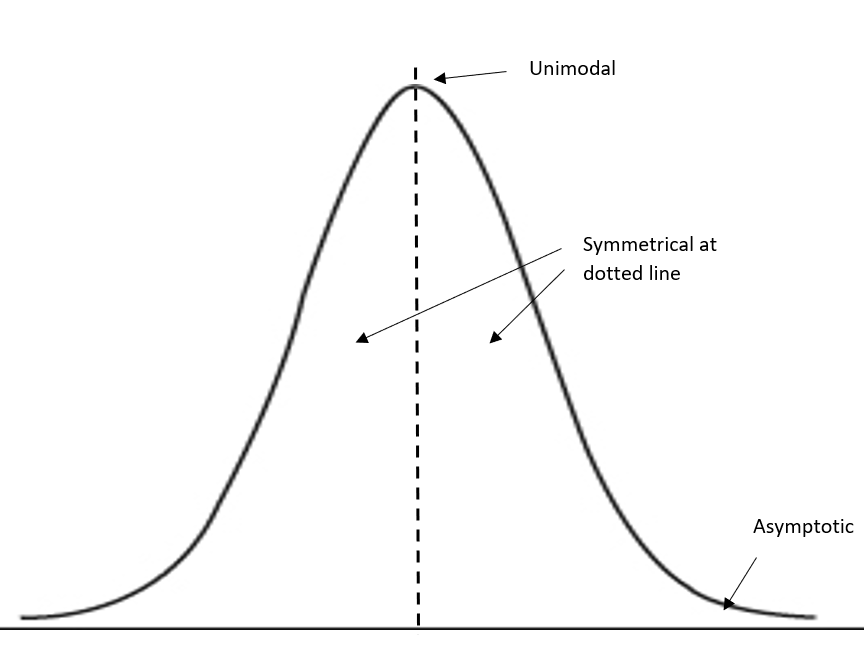 - Distributed in such a way that the majority of values are close to the central tendency (mean/median), with fewer extreme values (i.e. on lower and upper tails)
