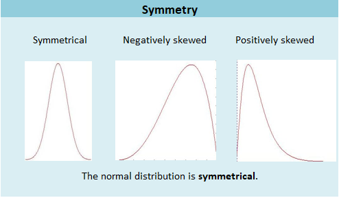 - Symmetrical (i.e. either side of the distribution is a mirror image from the center)