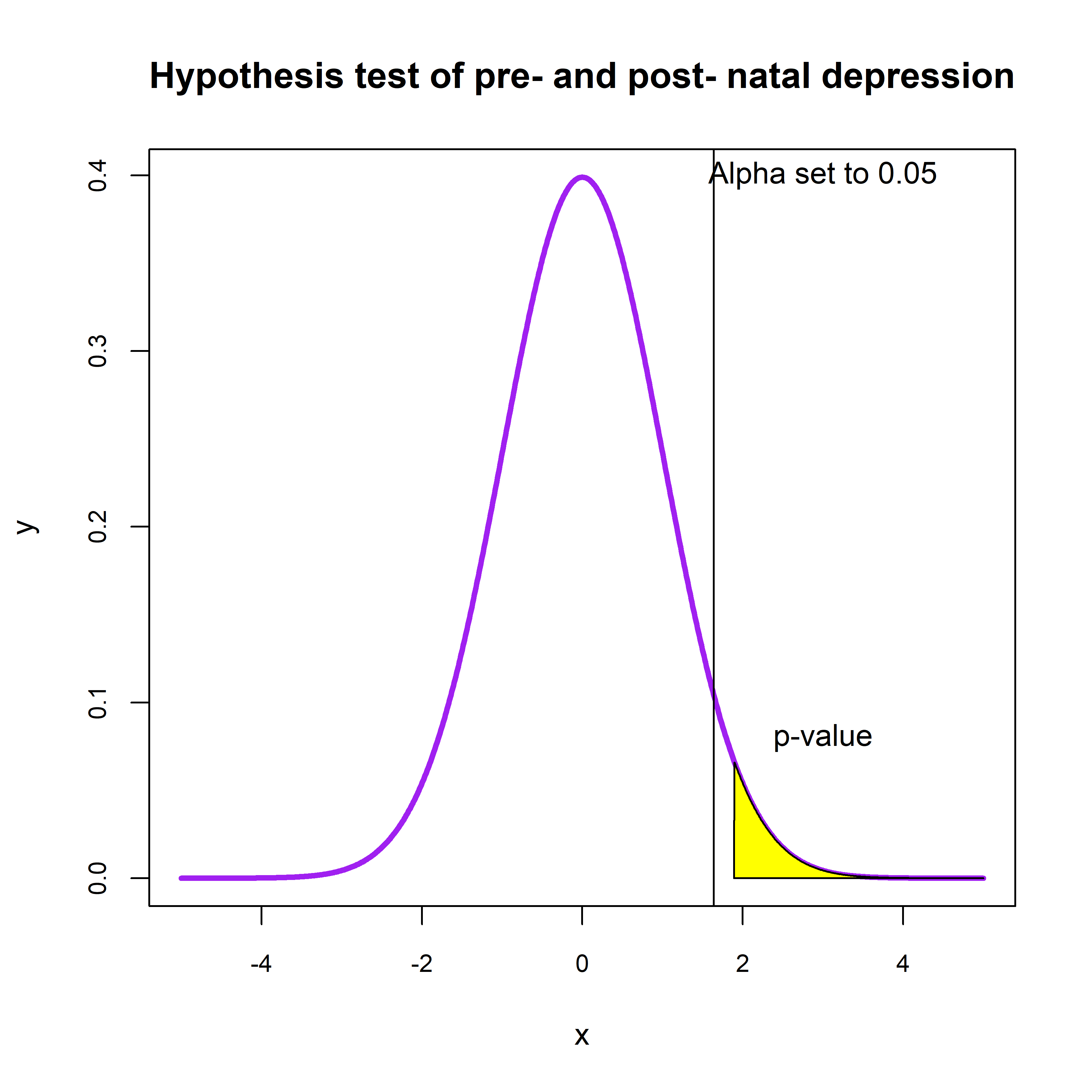 In this case, by rejecting the null hypothesis we say that we reject the claim that mean pre-natal and post-natal depression scores are equal, and favour the alternate hypothesis, that mean post-natal depression is higher than mean pre-natal depression.