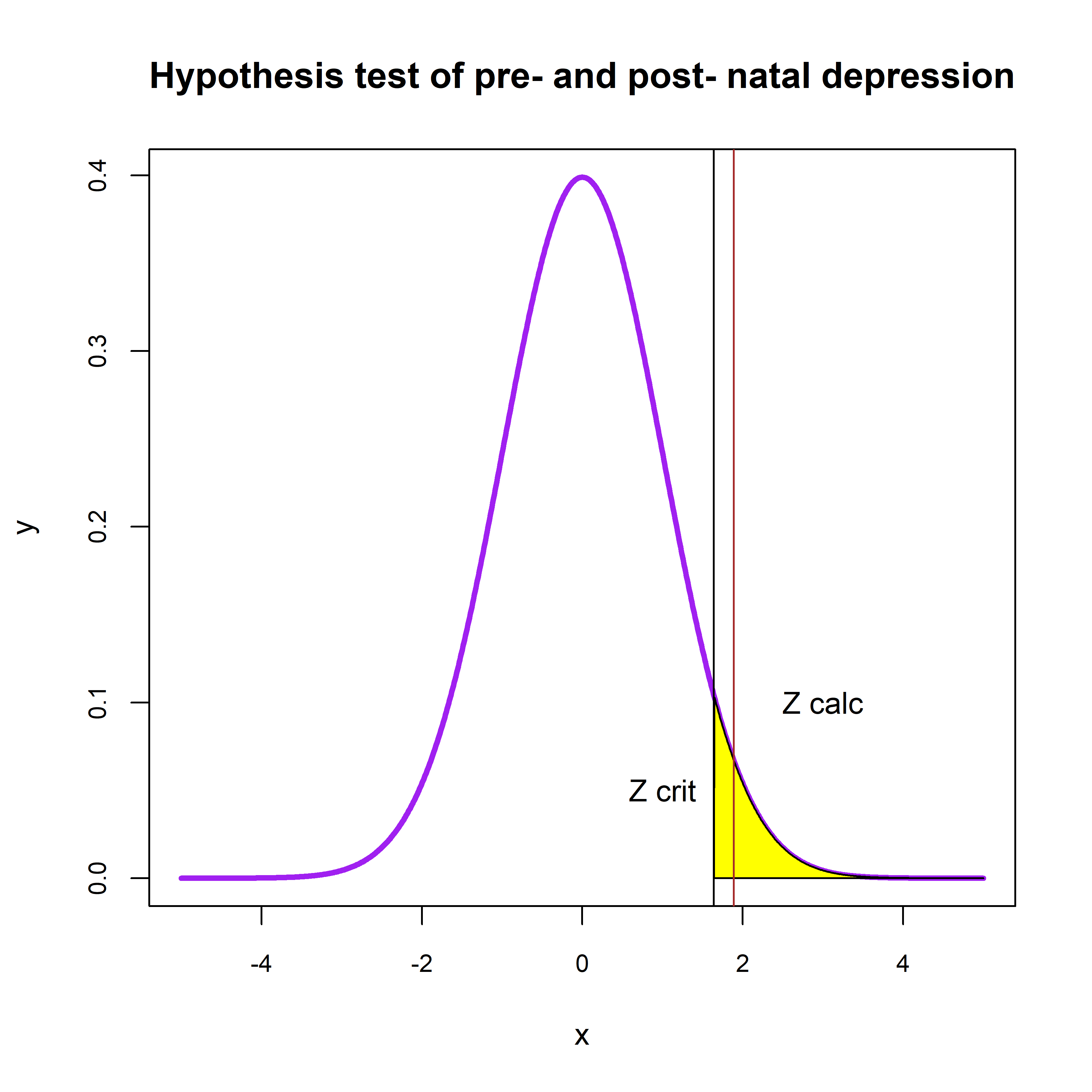 In the case of pre and post-natal depression, the \({Z_{calc}}\) is 1.89 and the \({Z_{crit}}\) is 1.64. See graphical display of \({Z_{crit}}\) and \({Z_{calc}}\) values below.