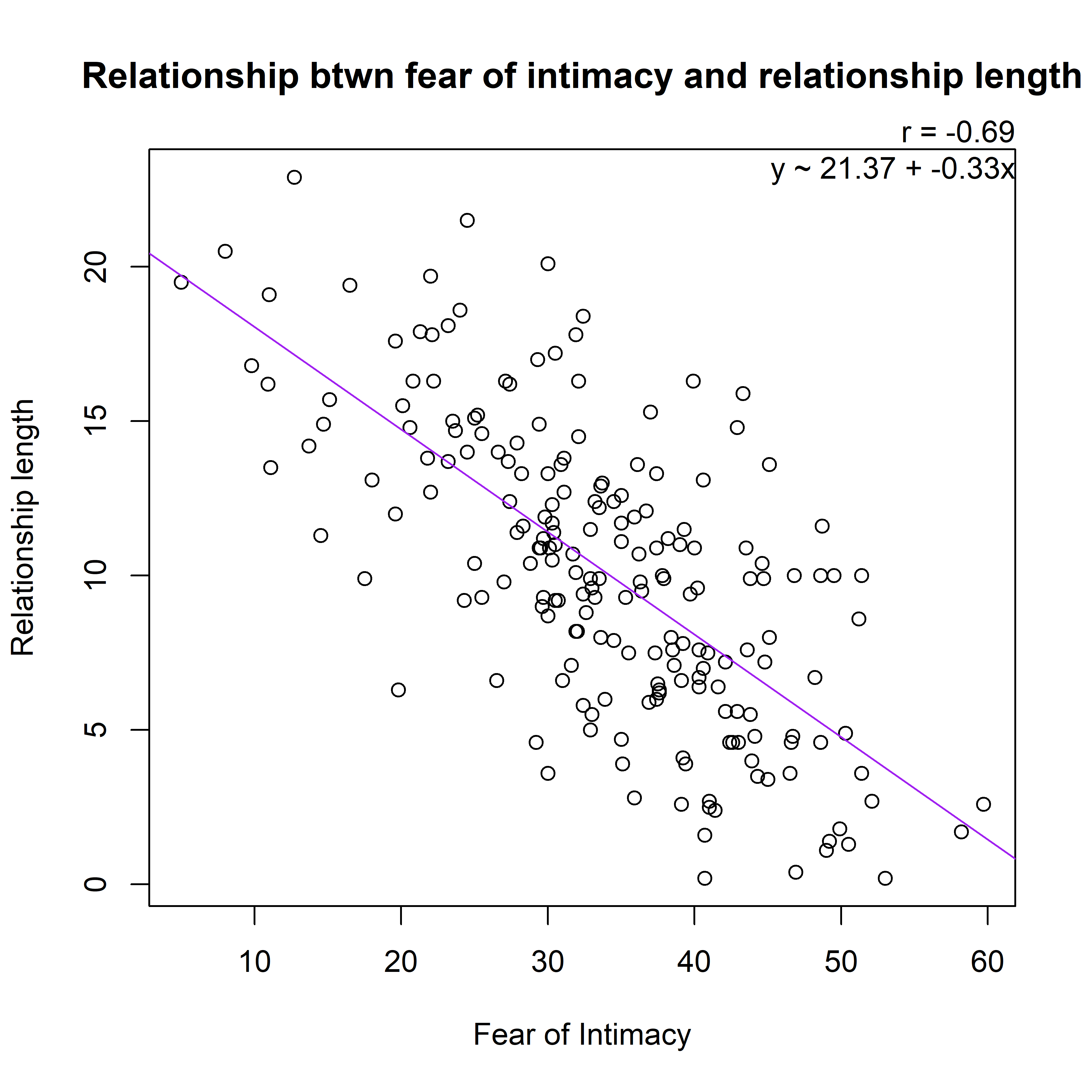 In the case of the relationship between fear of intimacy and relationship length, both \(r\) (-0.69) and \(b\) (-0.33) are shown in the figure below.